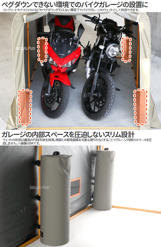 ペグ打ちができないコンクリートなどの環境下でガレージの設置に活躍します。