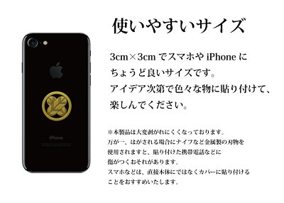 長宗我部元親「七つ片喰」、宇喜多秀家「睨」 河井継之助「丸に片喰」 ※シール柄サイズ:(約)30mm×30mm 色違い(30mmタイプ)はこちら 24mmタイプはこちら 55mmタイプはこちら 蒔絵 蒔絵ステッカー 蒔絵シール シール ステッカー まきえ 家紋 かもん 金家紋 蒔絵 ゴールド 転写シール ケータイ 携帯電話 スマホ スマートフォン 剣道 胴 和 伝統 強力 はがれにくい 耐久性 耐水性