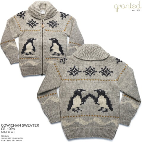 カウチンセーター|granted(グランテッド)・カナダ製|GR-109b PENGUIN(ペンギン)|グレイ・チャコール|メンズ|ウール100%|フルオープン|YKK製ジップアップ(two-way YKK Zipper)|木製ラベルの引き手|カウチンニット|長袖 10P11Mar16