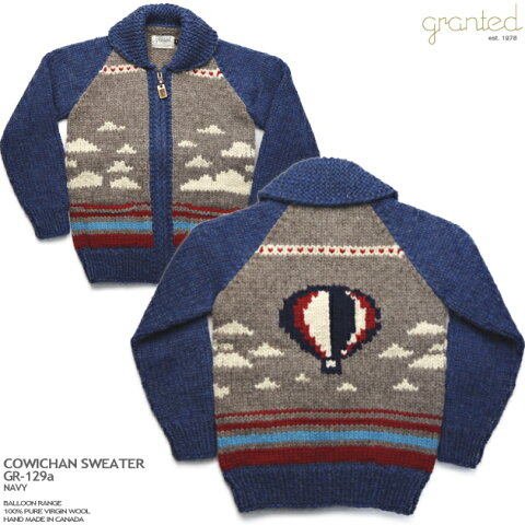 カウチンセーター|granted(グランテッド)・カナダ製|GR-129a BALLOON RANGE(バルーン レンジ)|ネイビー|メンズ|ウール100%|フルオープン|YKK製ジップアップ(two-way YKK Zipper)|木製ラベルの引き手|カウチンニット|長袖