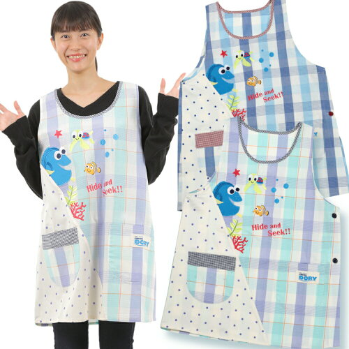 幼稚園の保母さん・保育士・介護士・看護師の方におすすめのキャラクターエプロン ◆ファインディングニモのキャラクターがアップリケと刺繍で施されたゴキゲンなデザイン! ◆全面に大きいスマホ等がすっぽり入るポケットが2個あります。